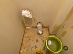 既設トイレを外し、天井・壁のクロス/床のクッションフロアを剥がしました。
